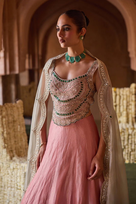 Ready To ShipSLATE GREY EMBROIDERED BLOUSE WITH DHOTI SKIRT SAREE SET