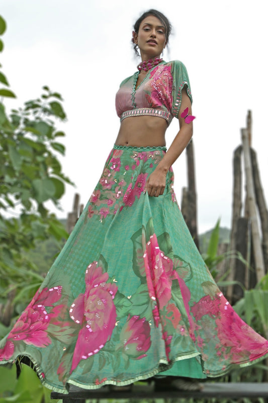 Emerald Green Chiffon Embroidered Co-Ord Set