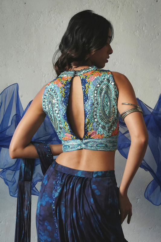 Blue Chiffon Handwork Pre-Draped Saree Set