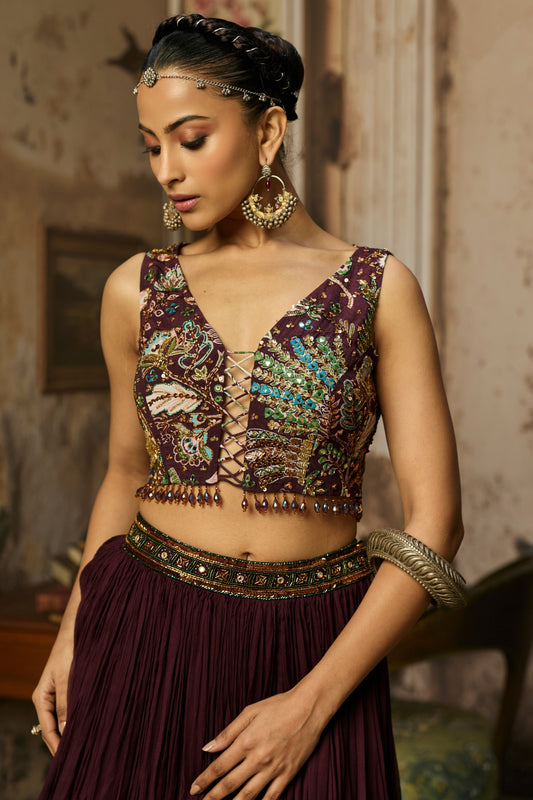 PLUM PRINTED AND HIGHLIGHTED CORSET LEHENGA SET