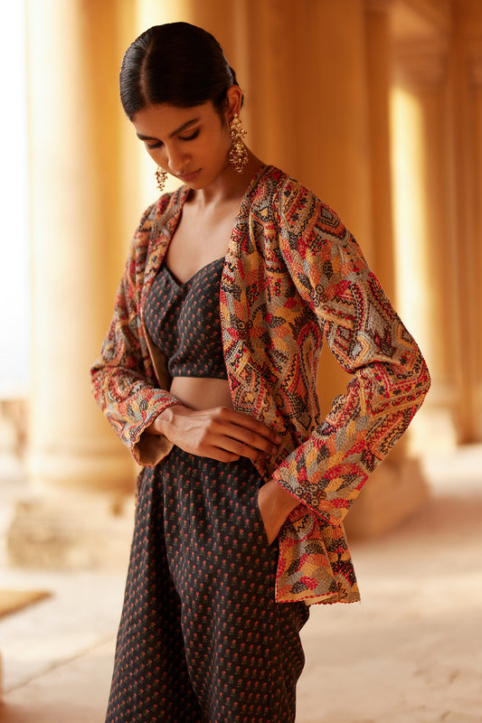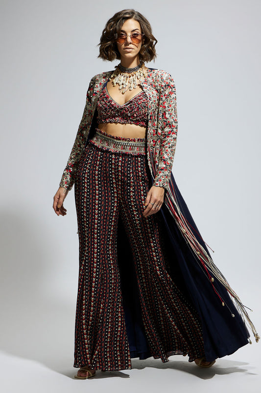 Blue Threadwork Embellished Jacket Paired with Textured Bustier and Blue Printed Sharara Pants