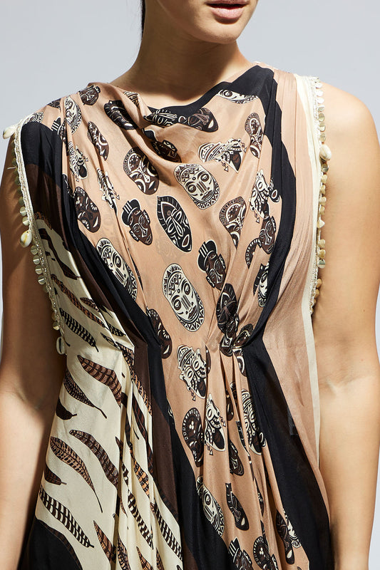 Mask and Feather Print Crop Top with Attached Drape with Pants