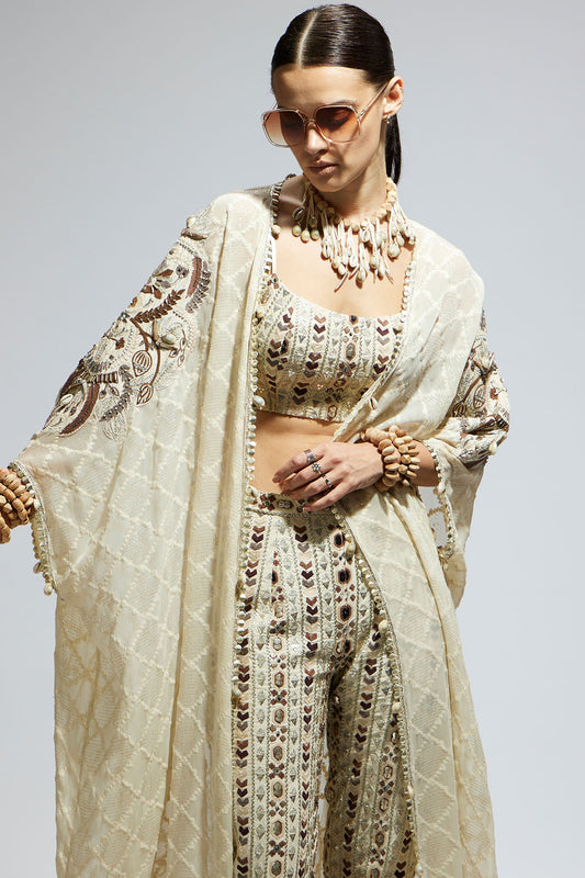 Ivory Aztec Embellished Cape Paired with Heavily Embellished Bustier and Pants