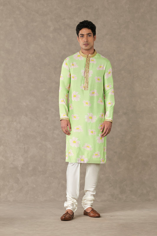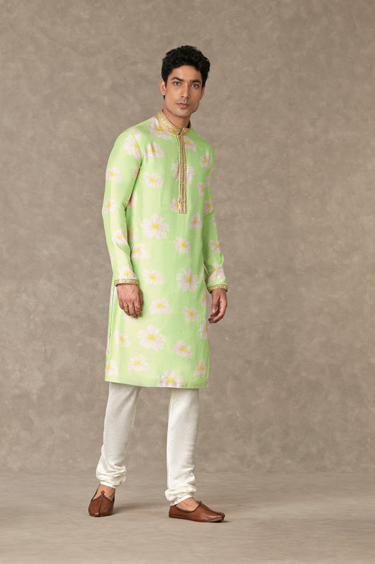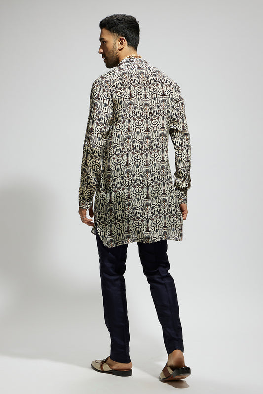 White Leaf Jaal Print Rolled up Sleeves Kurta