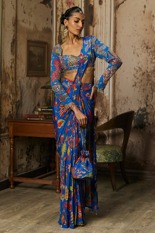 ELECTRIC BLUE EMBELLISHED BLOUSE AND PRE-DRAPED DHOTI SAREE SET