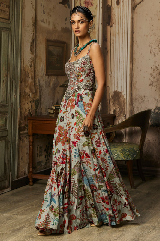 SLATE GREY PRINTED AND HIGHLIGHTED CORSET GOWN