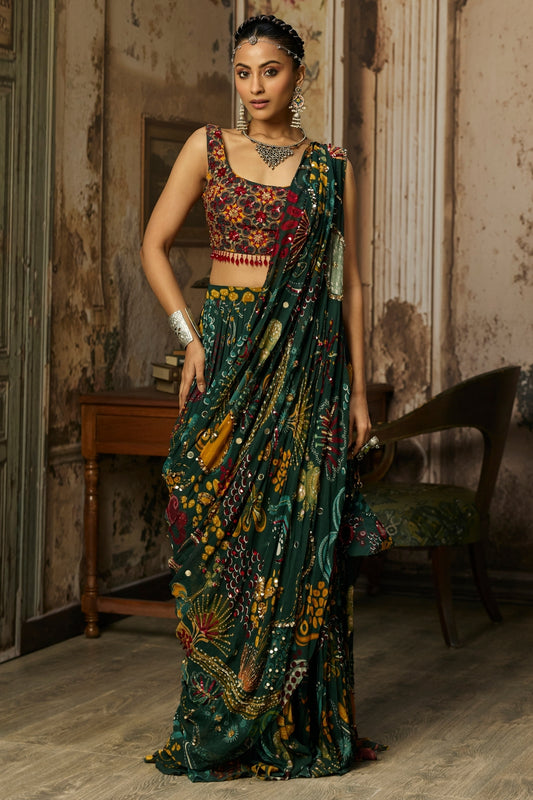 DARK GREEN PRINTED AND HIGHLIGHTED TIERED SKIRT SAREE SET