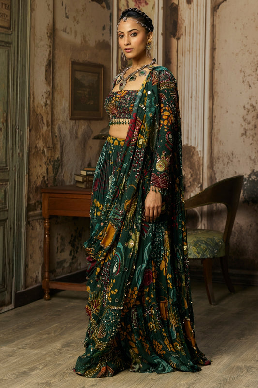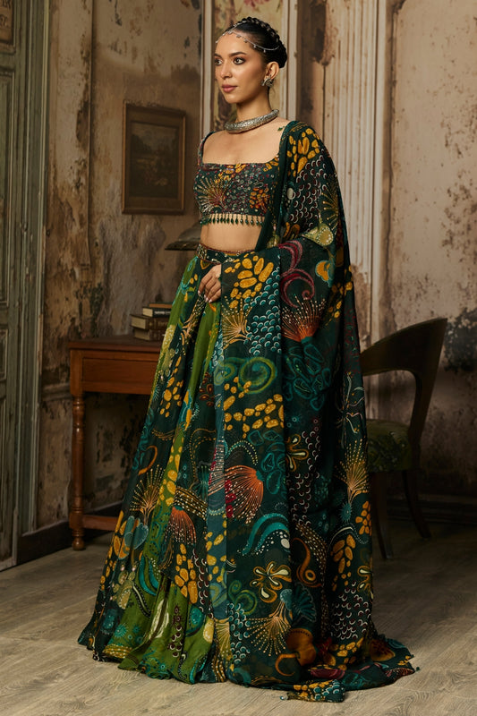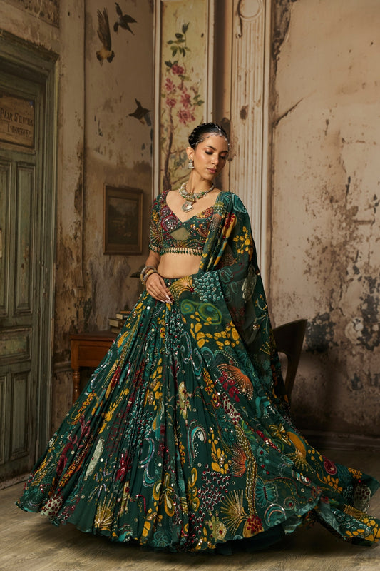 DARK GREEN EMBELLISHED BOUSE WITH PRINTED AND HIGHLIGHTED LEHENGA SET
