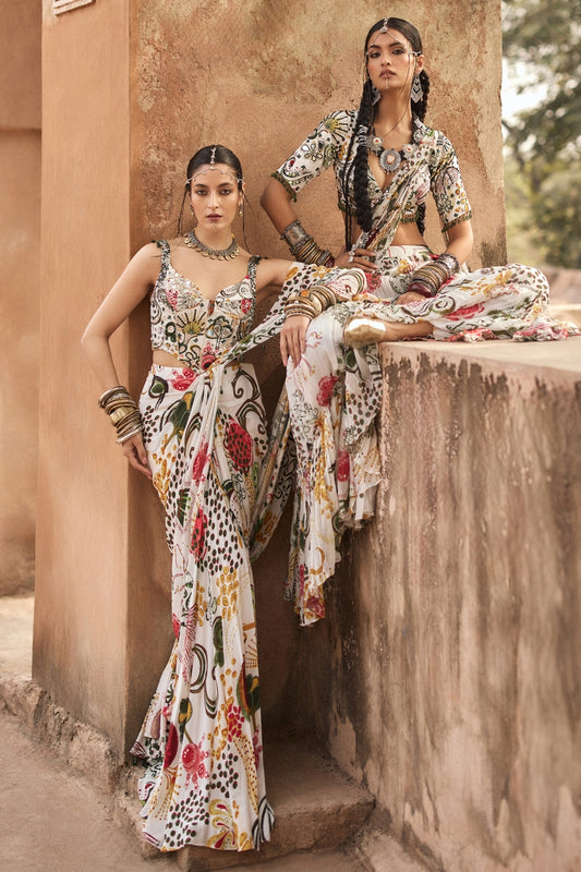 IVORY PRINT AND HIGHLIGHTED CORSET WITH DHOTI SKIRT SAREE SET