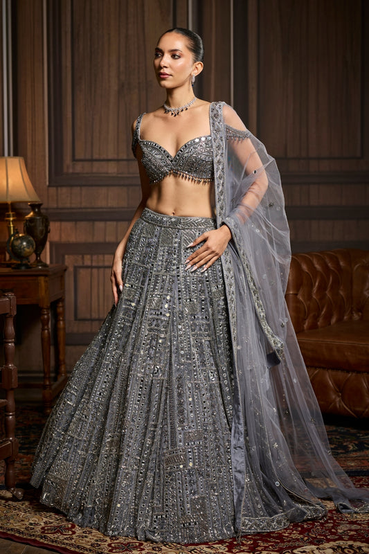 Gunmetal Embellished Mirrorwork Lehenga Set