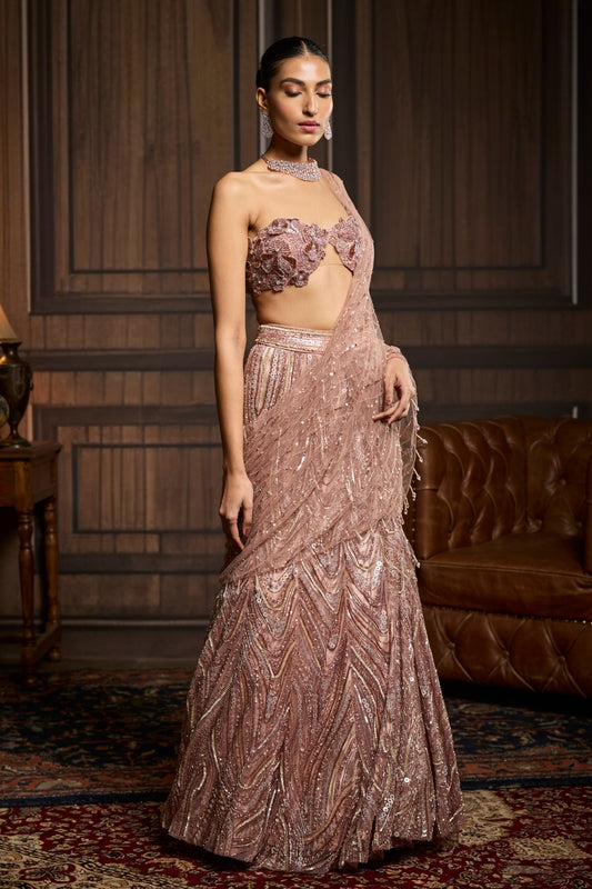Blush Pink Embellished Pre-draped Skirt Saree Set