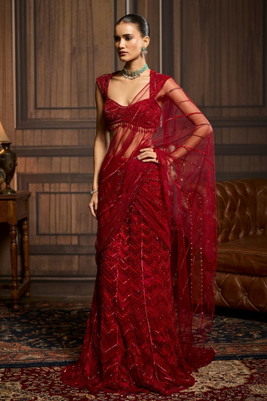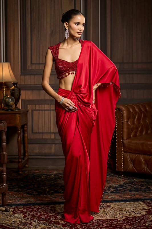 RED EMBELLISHED DRAPED PRE-DRAPED SKIRT SAREE SET