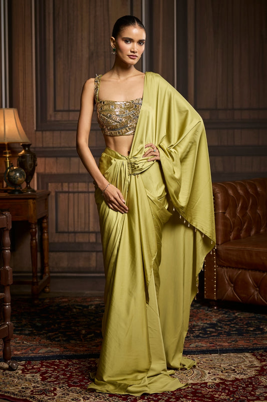 PEAR GREEN EMBROIDERED BLOUSE AND PRE DRAPED SAREE SET