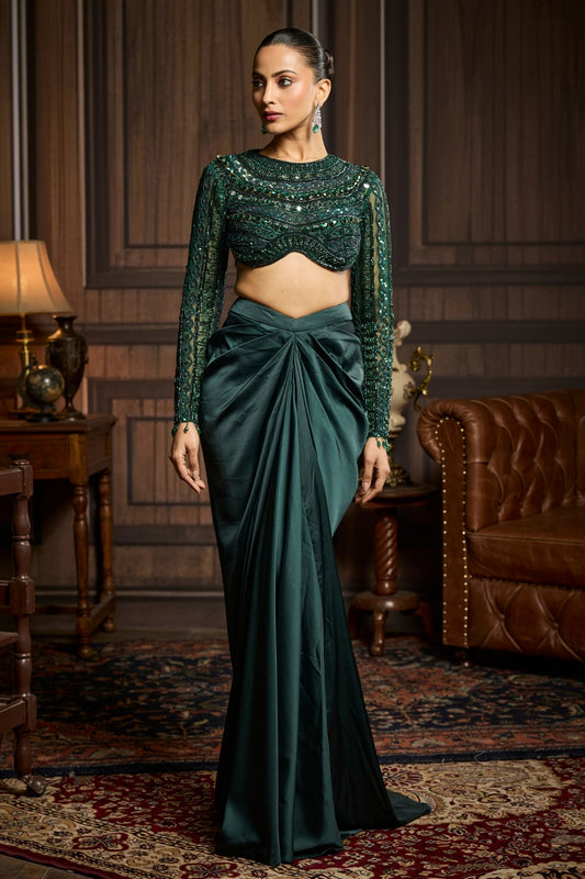 EMERALD GREEN EMBELLISHED BLOUSE AND PRE-DRAPED SAREE SET