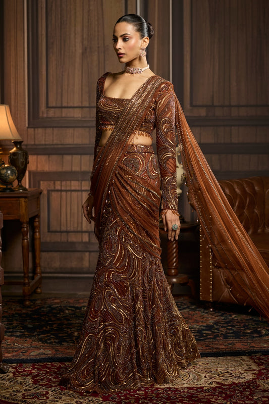 CARAMEL BROWN FULLY EMBROIDERED MERMAID TRAILSKIRT SAREE SET