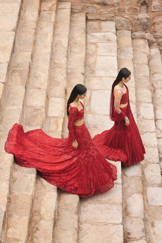 VERMELLION RED EMBELLISHED PRE-DRAPED SKIRT SAREE SET