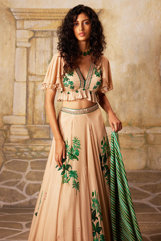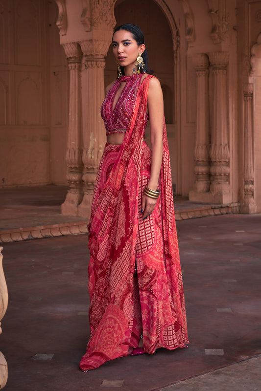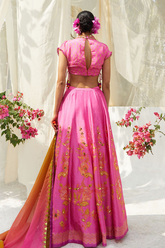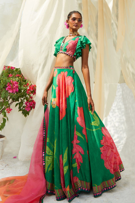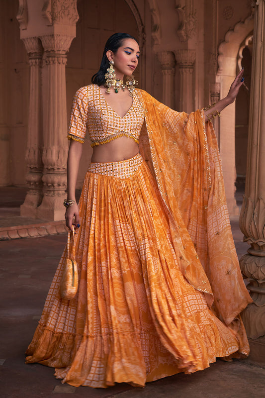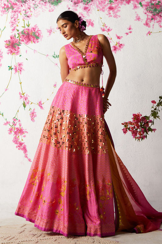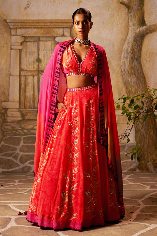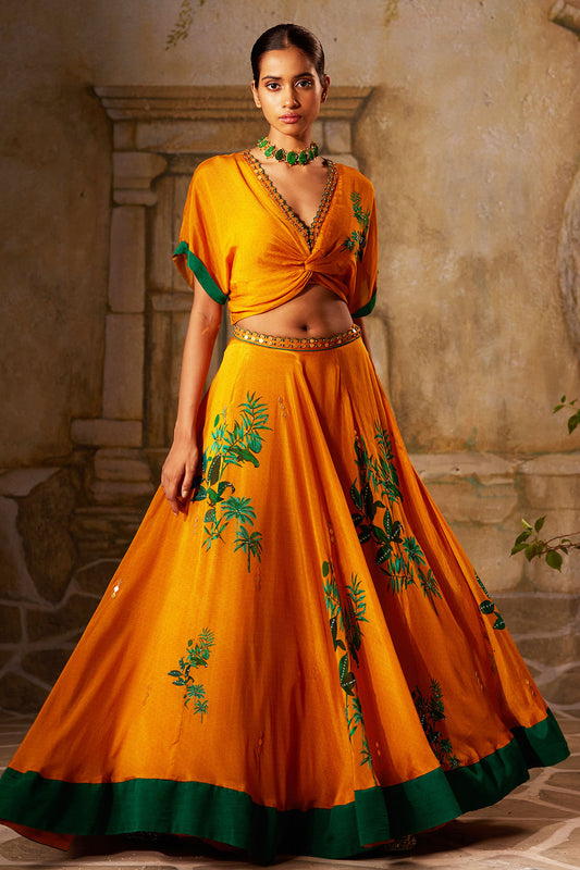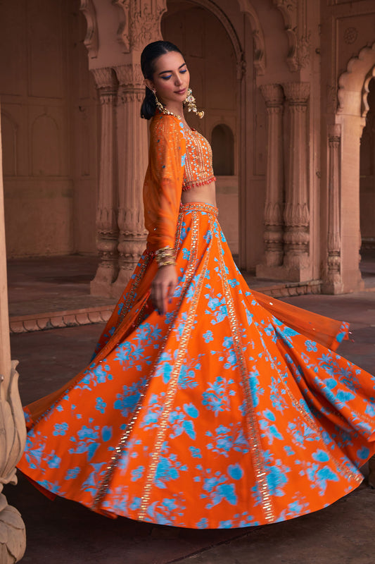 TANGERINE FLORAL PRINT & HIGHLIGHTED LEHENGA SET