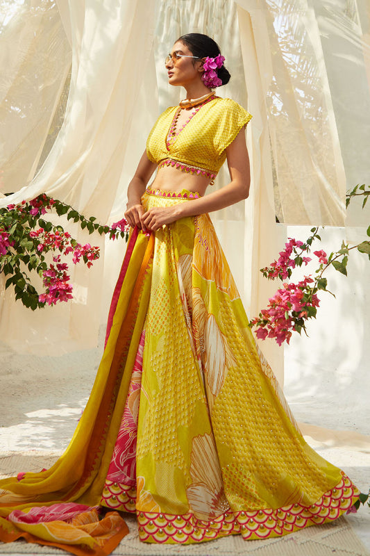 MUSTARD THIKRI PRINT & HIGHLIGHTED LEHENGA SET
