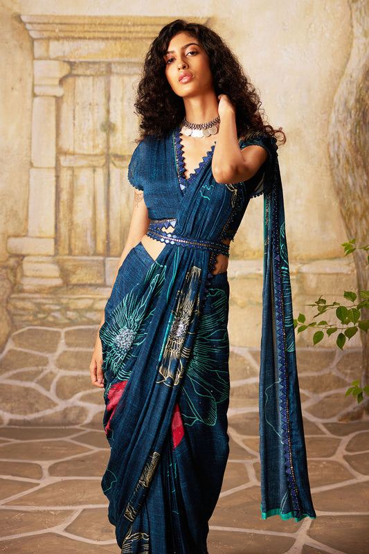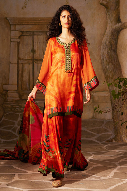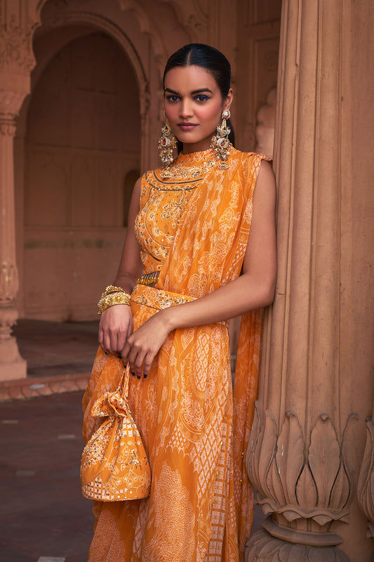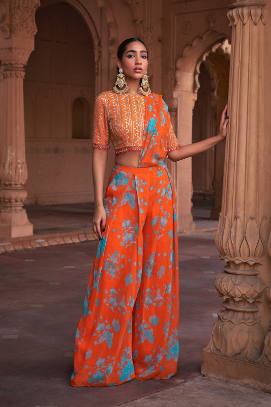 TANGERINE FLORAL PRINT & HIGHLIGHTED SAREE SET