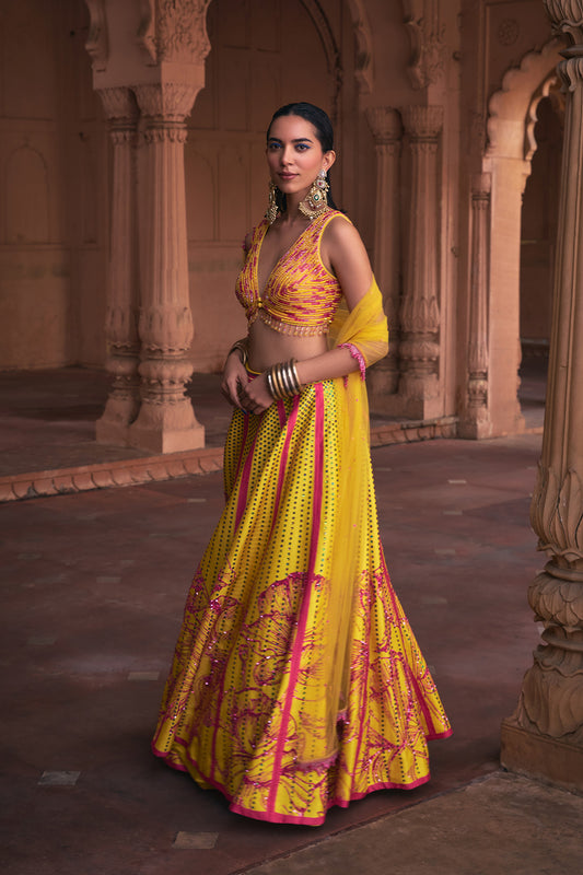 YELLOW BIG FLORAL PRINT & EMBROIDERED LEHENGA SET