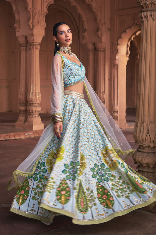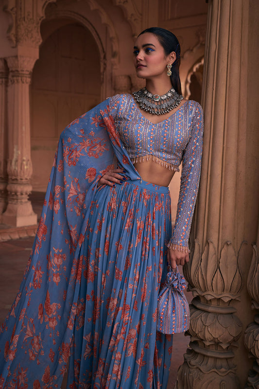 POWDER BLUE FLORAL PRINT & EMBROIDERED LEHENGA SET