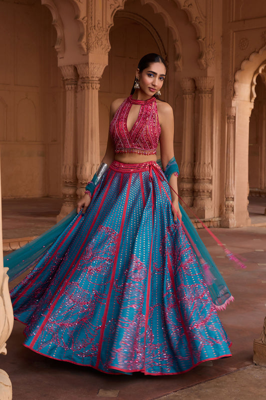 TEAL BIG FLORAL PRINT & EMBROIDERED LEHENGA SET