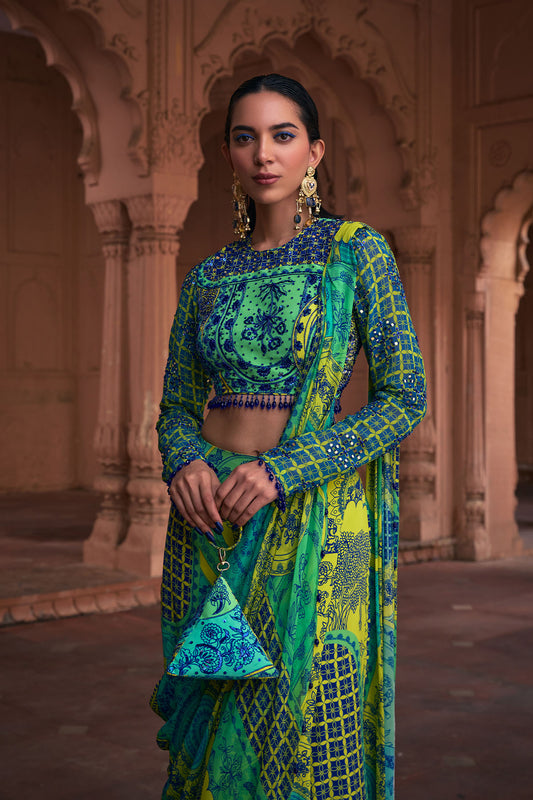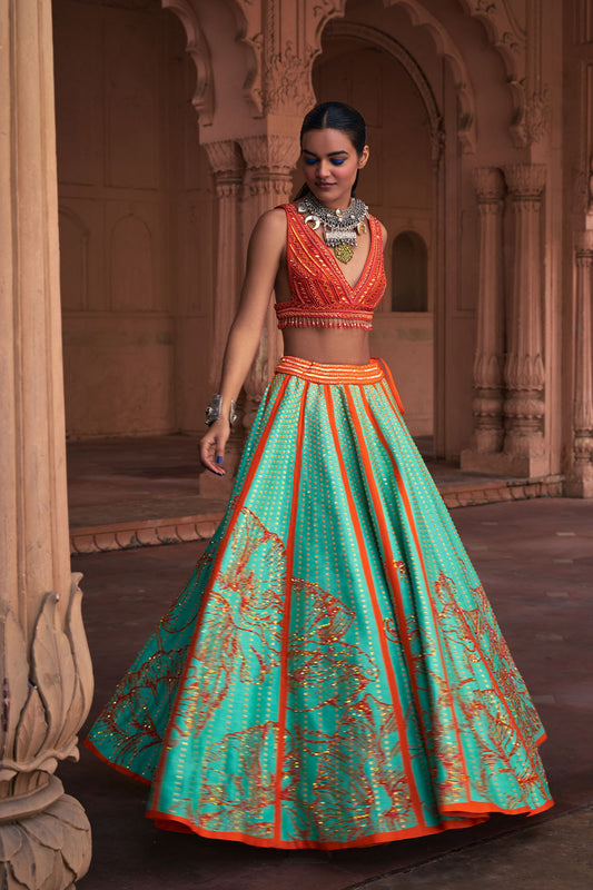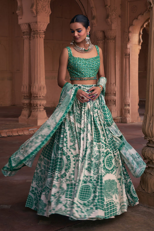 SEAGREEN BIG FLORAL PRINT & EMBROIDERED LEHENGA SET