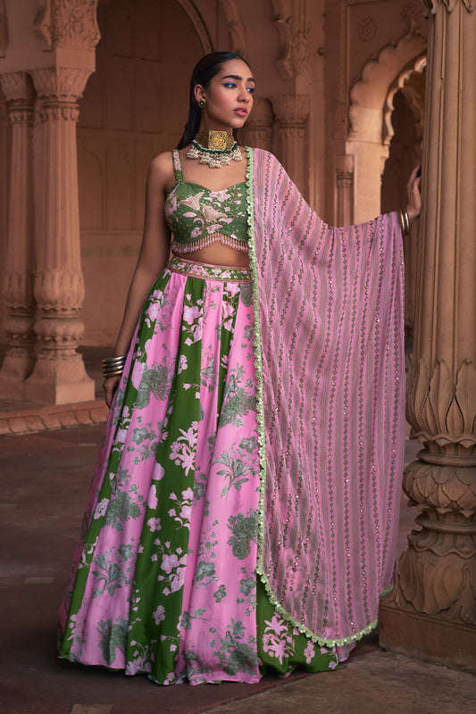 SAGE GREEN FLORAL PRINT & HIGHLIGHTED LEHENGA SET