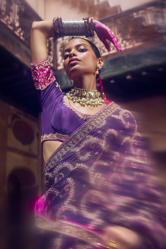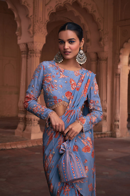 SLATE BLUE FLORAL PRINT & HIGHLIGHTED SAREE SET