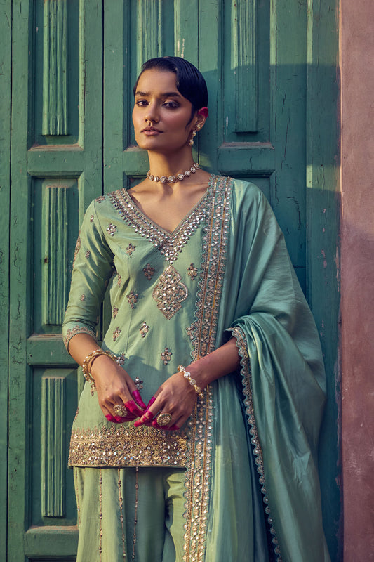 SAGE GREEN THIKRI PRINT & HIGHLIGHTED SAREE SET