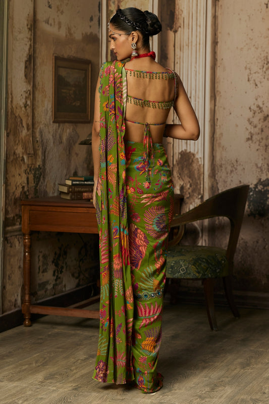 PEAR GREEN EMBROIDERED BLOUSE AND PRE DRAPED SAREE SET