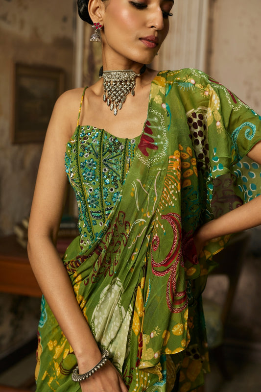 PEAR GREEN PRINTED AND HIGHLIGHTED PRE-DRAPED SLIT SKIRT SAREE SET