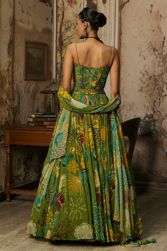 PEAR GREEN PRINTED AND HIGHLIGHTED CORSET LEHENGA SET