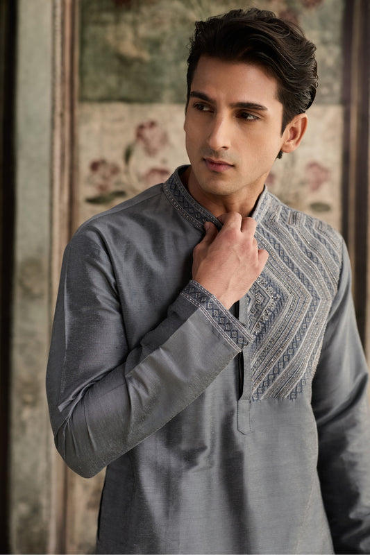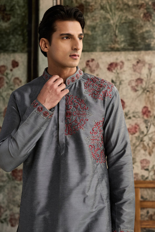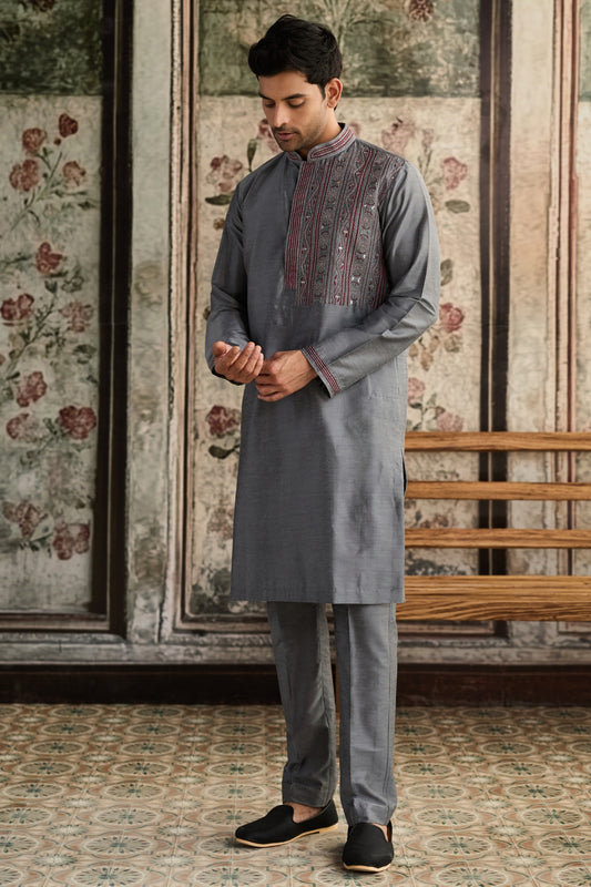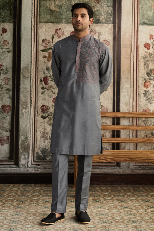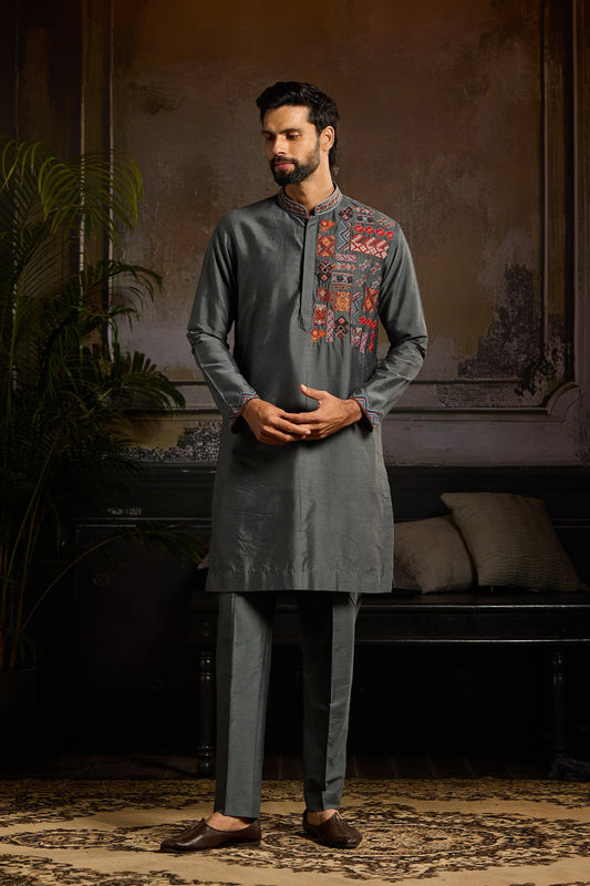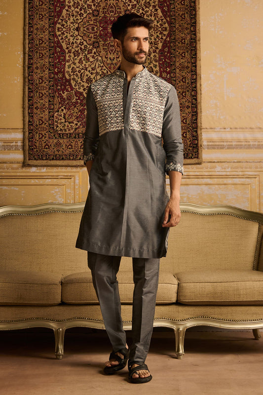 GREY WITH GUNMETAL EMBROIDERED KURTA WITH GREY PANTS