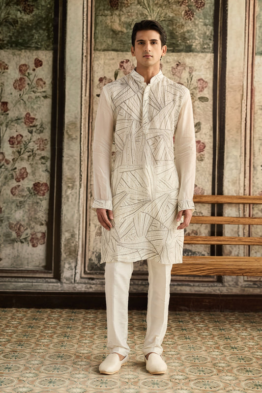 IVORY WITH INDIGO BLUE GEOMETRIC EMBROIDERED KURTA WITH IVORY PANTS