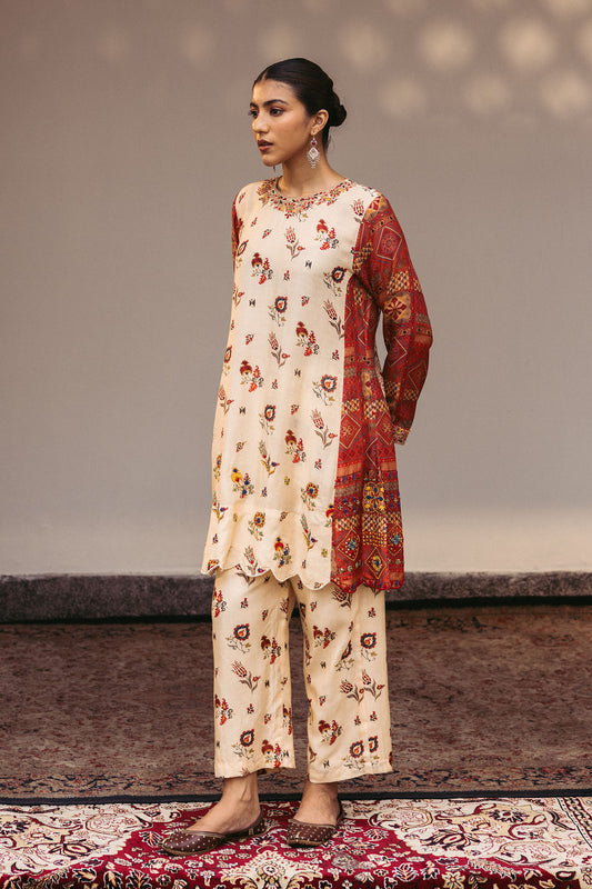 Cream and Red Highlighted Hem Cutwork Short Kurta