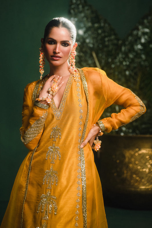 Orange Jaal v Neck Heavily Embellished Kurta Set
