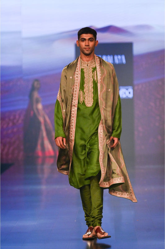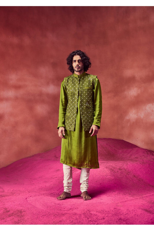 Olive Green Silk Kurta With Bandi & Churidar