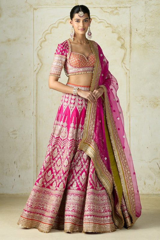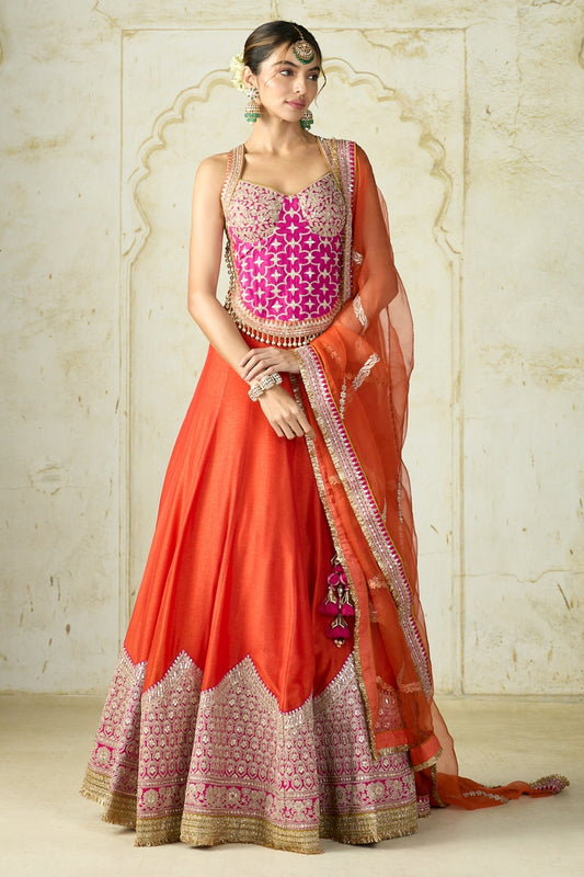 Orange & Pink Organza Floral Lehenga Set