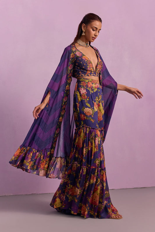 Purple Embroidery Patch Printed Short Kurta with Sharara