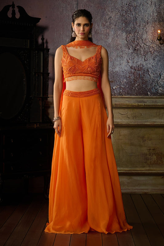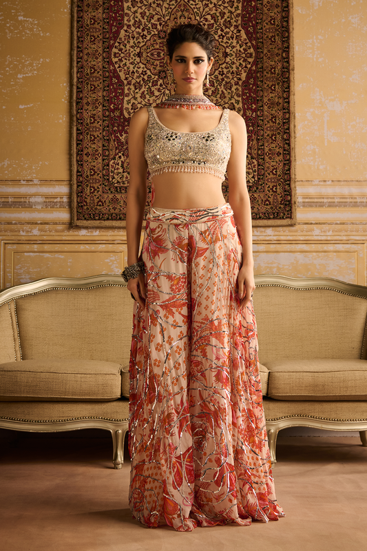 Silver embroidered blouse and Orange cosmic floral jaal Sharara set