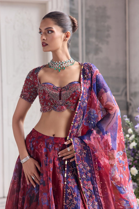 Ready To ShipRUST FLORAL PRINT AND HIGHLIGHTED LEHENGA SET
