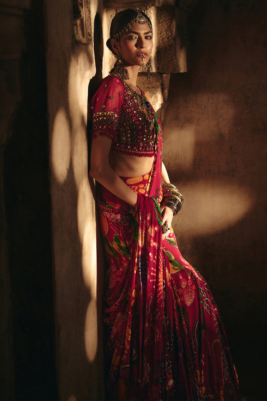 SCARLET RED PRINTED AND HIGHLIGHTED DHOTI SKIRT SAREE SET