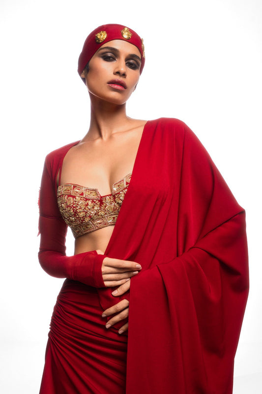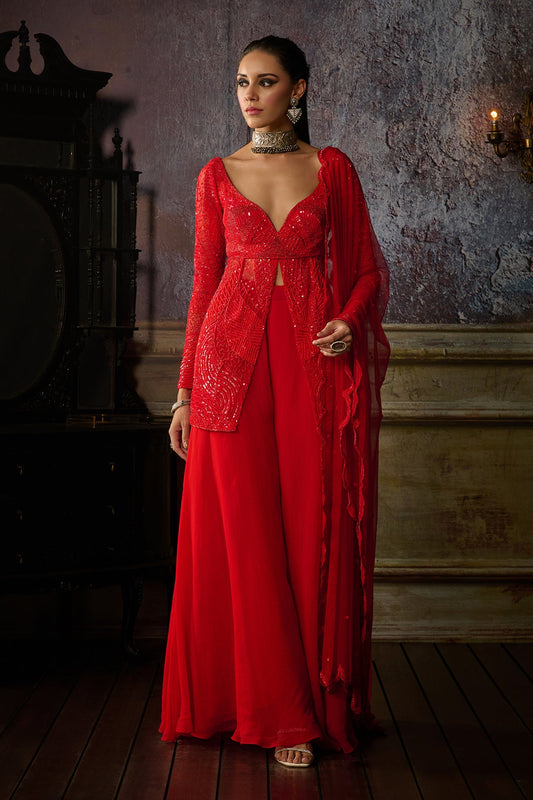 RED EMBROIDERED PEPLUM WITH ORGANZA SHARARA AND DUPATTA