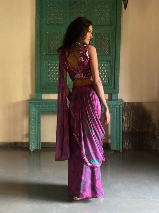 Breezy Blue Petal Printedpre-Draped Saree Set