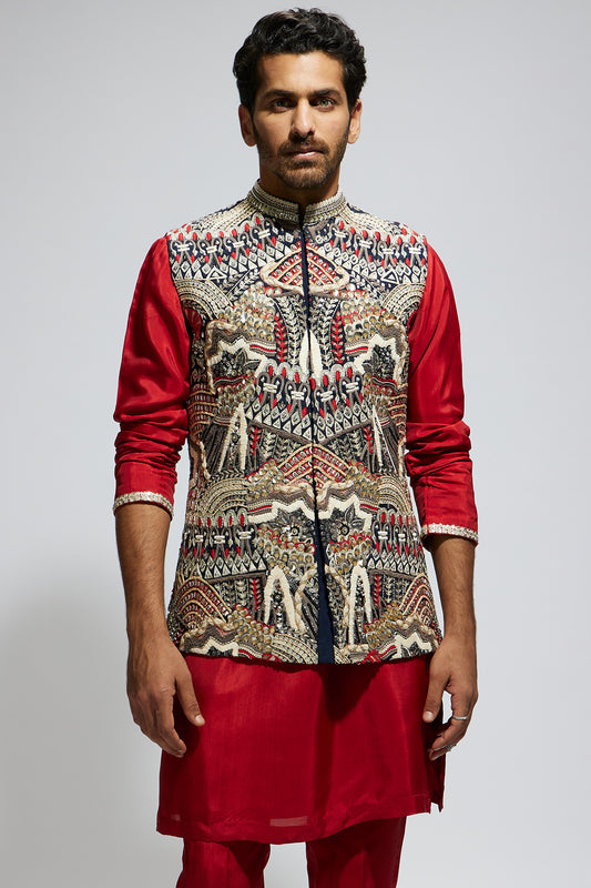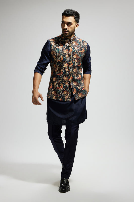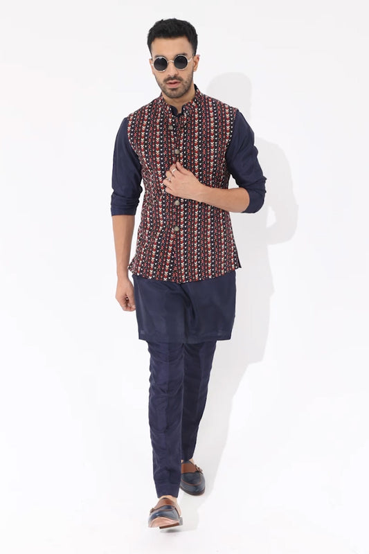Abstract Bundi Paired With Solid Blue Kurta And Pants