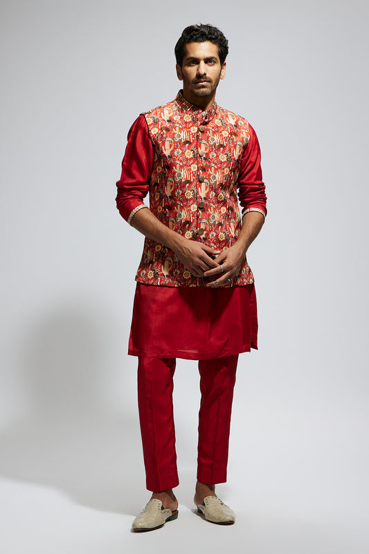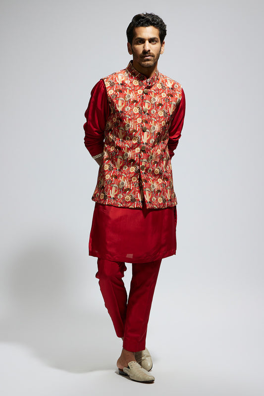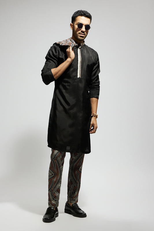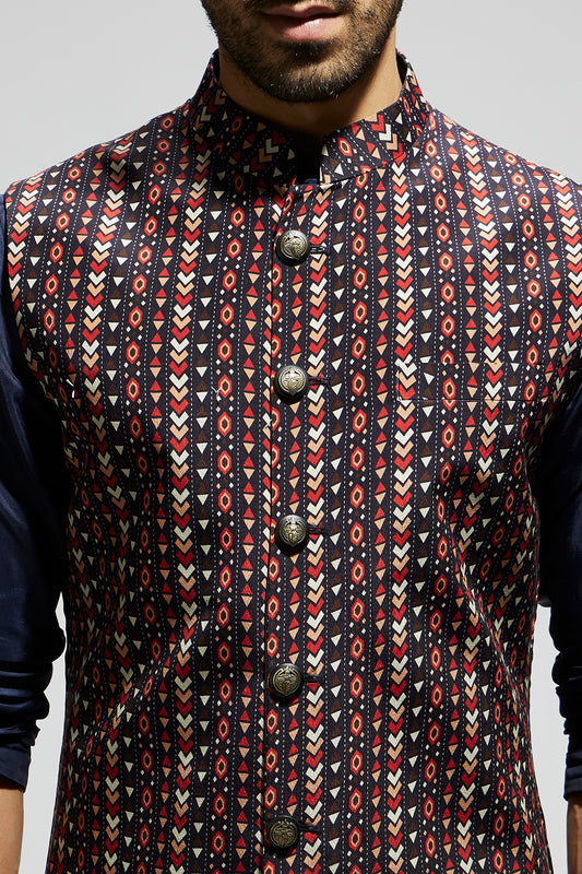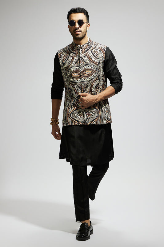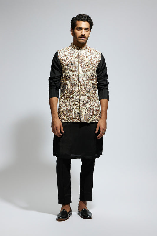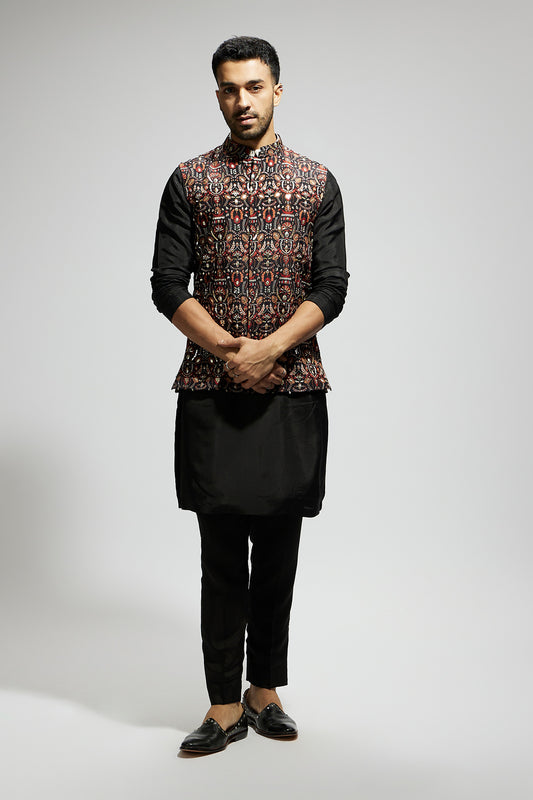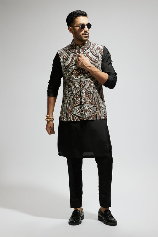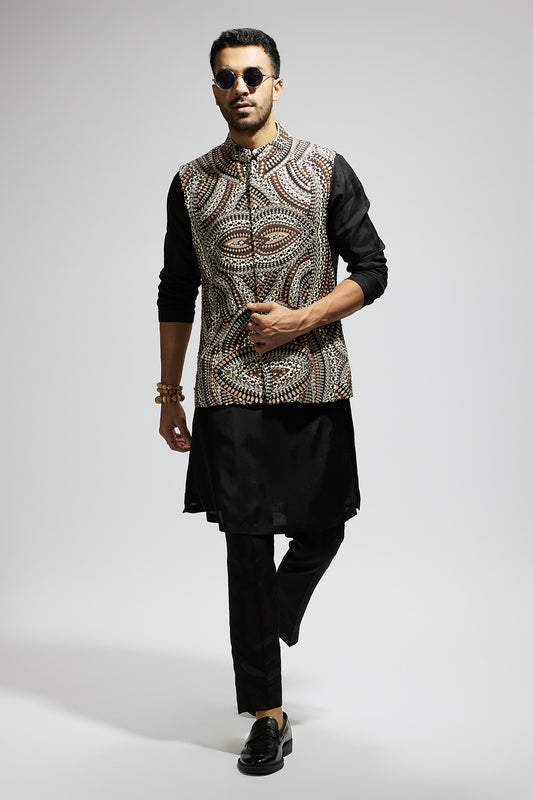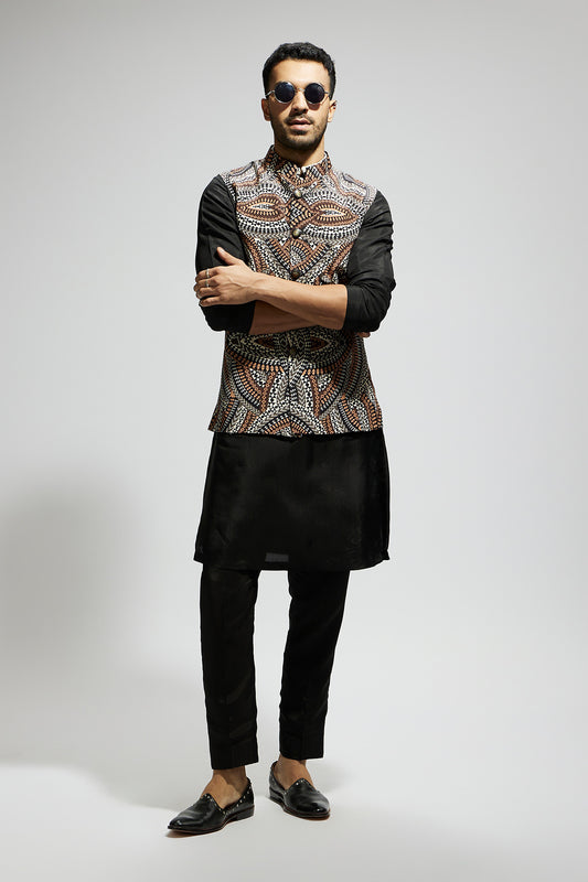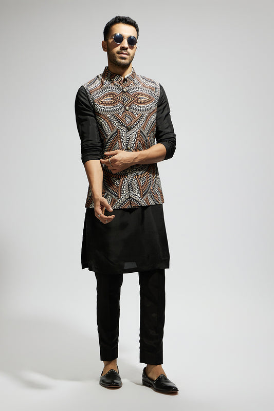 Zentangle Printed Bundi with Black Solid Kurta with Pants