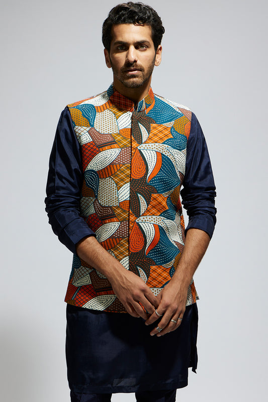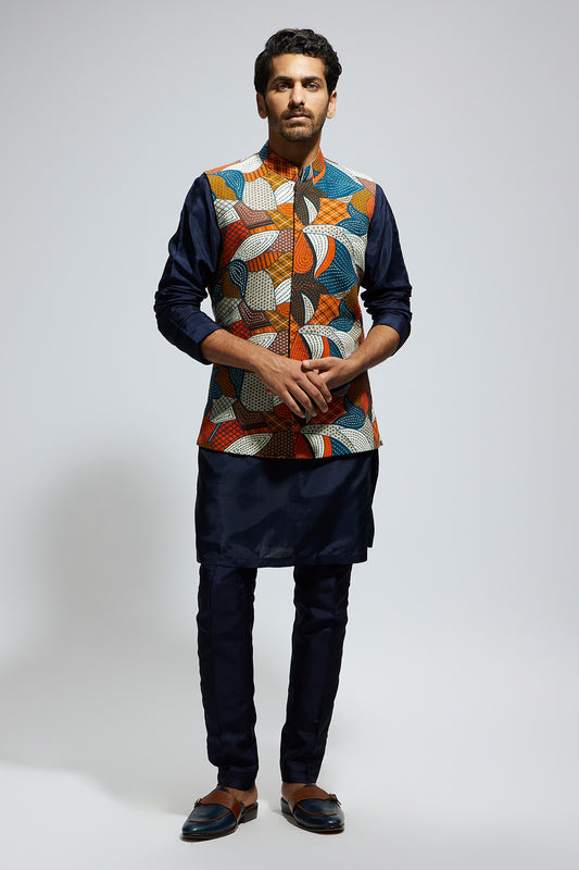 Blue Abtract Embroidered Bundi with Orange Solid Kurta and Pants