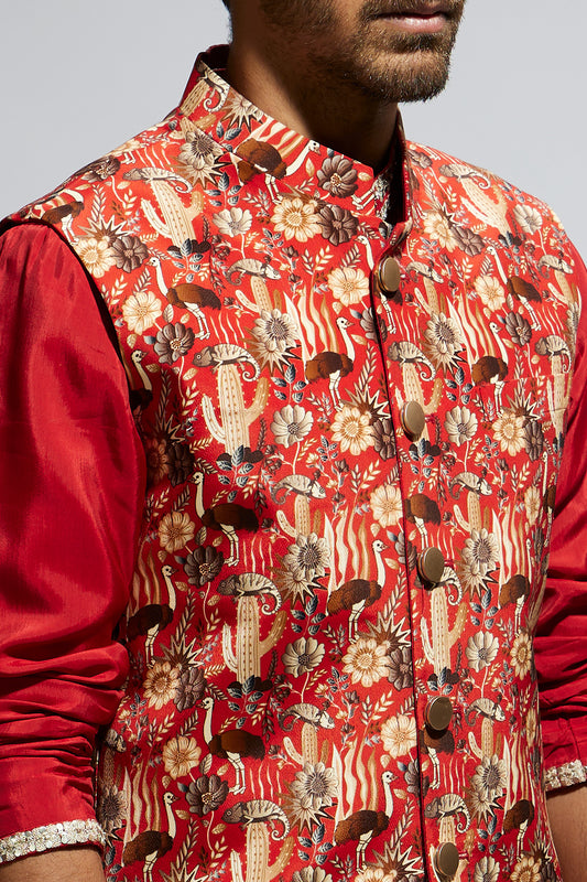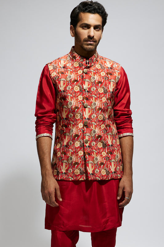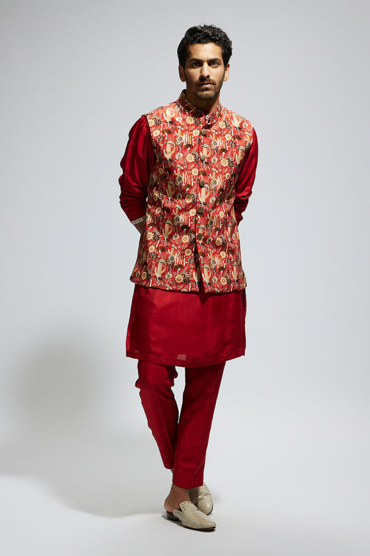 Orange Jaal Printed Bundi With Orange Solid Kurta With Pants