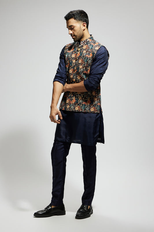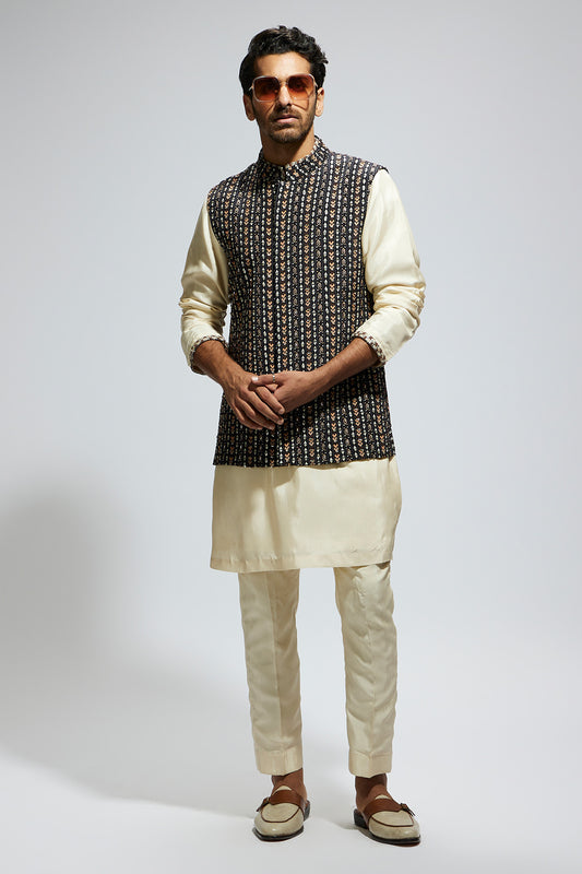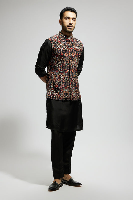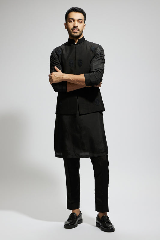 Black Leaf Jaal Embellished Bundi with Black Kurta and Pants